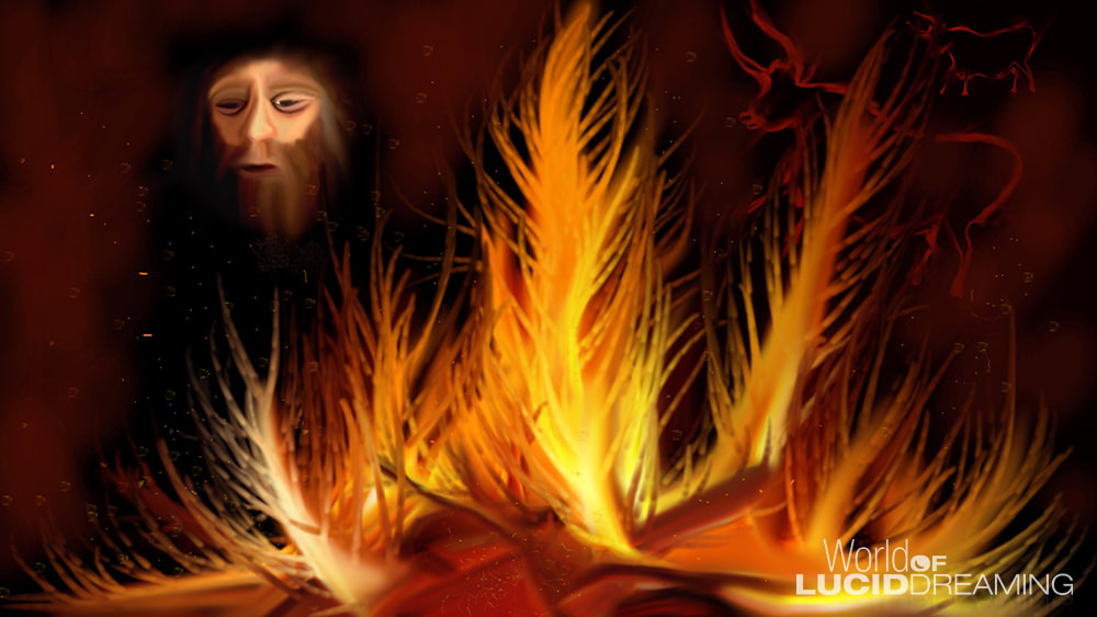 As we sit around the glowing fire it spontaneously occurs to me I'm dreaming and I become lucid. Suddenly my mood changes and I'm happy, but I stay with this gloomy caveman to see if I can probe his mind.